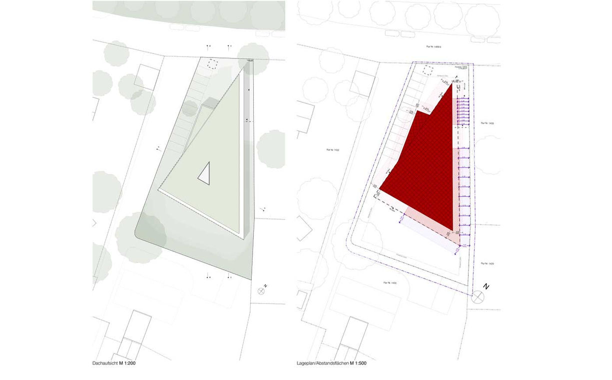 Der zukünftige Baukörper orientiert sich an der Ausrichtung des Grundstücks und läuft gen Norden spitz zu. Es entsteht eine charakteristische Dreiecksform, die durch ein zur Zufahrtsstraße hin geneigtes Dach verstärkt wird.
